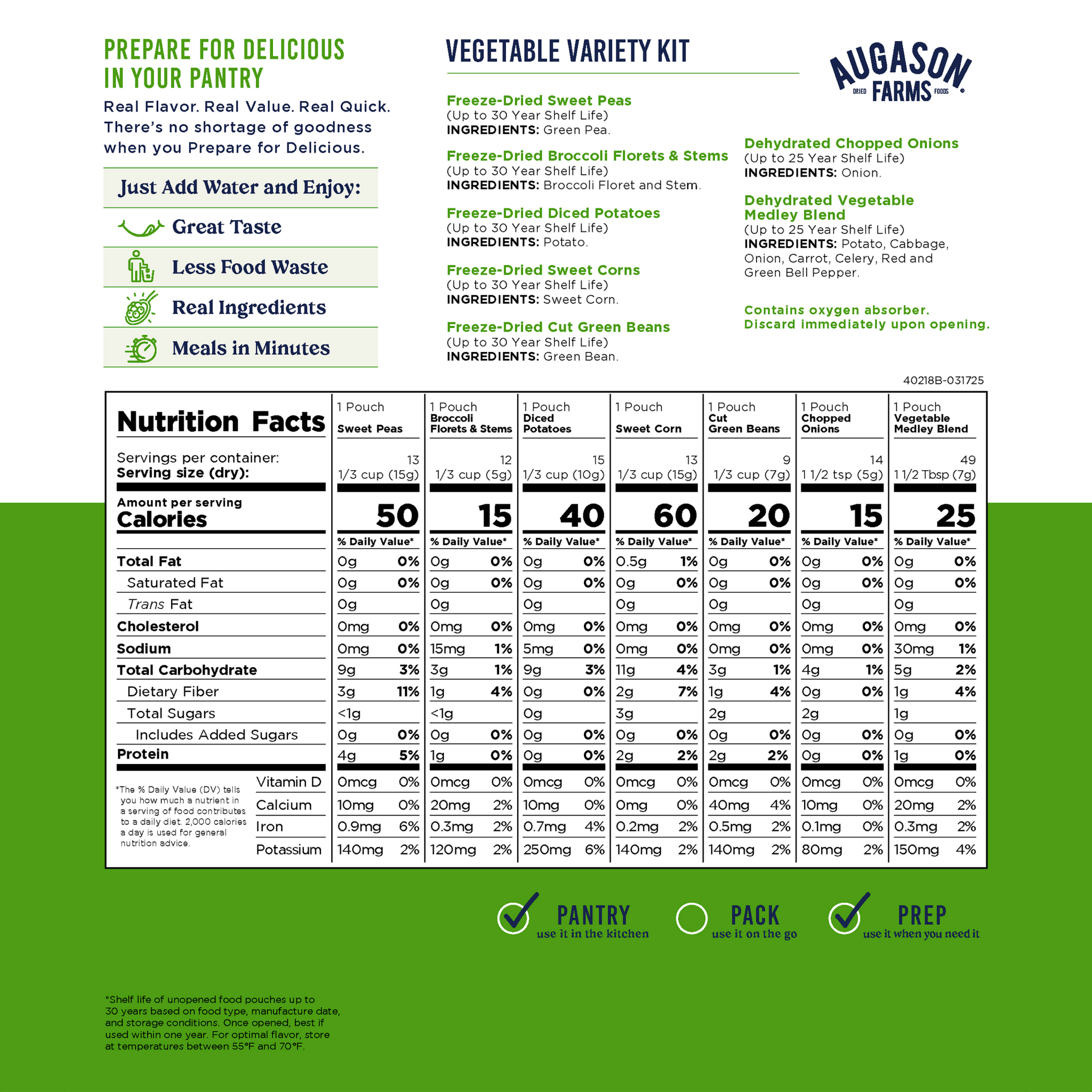 The Augason Farms Vegetable Variety Kit makes it easy to keep vegetables on hand for everyday cooking or long-term storage. With seven single-ingredient vegetables, this kit is versatile for soups, casseroles, sides, and more. Each pouch is easy to prepare with water and has no additives or preservatives. With up to a 30-year shelf life, you’ll always have vegetables ready when you need them.
