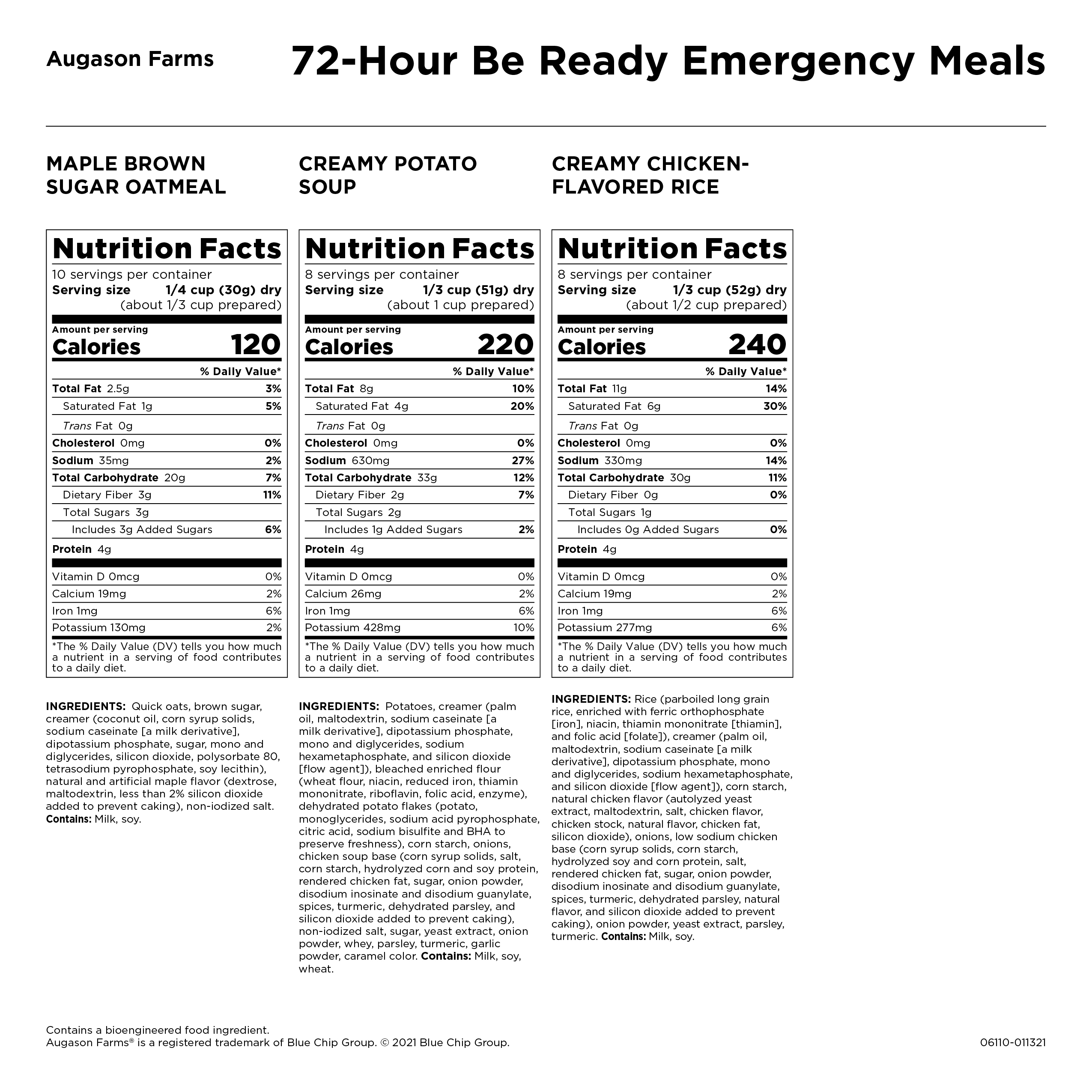 - Three meals for one person for three days, including oatmeal, potato soup, and chicken flavored rice.