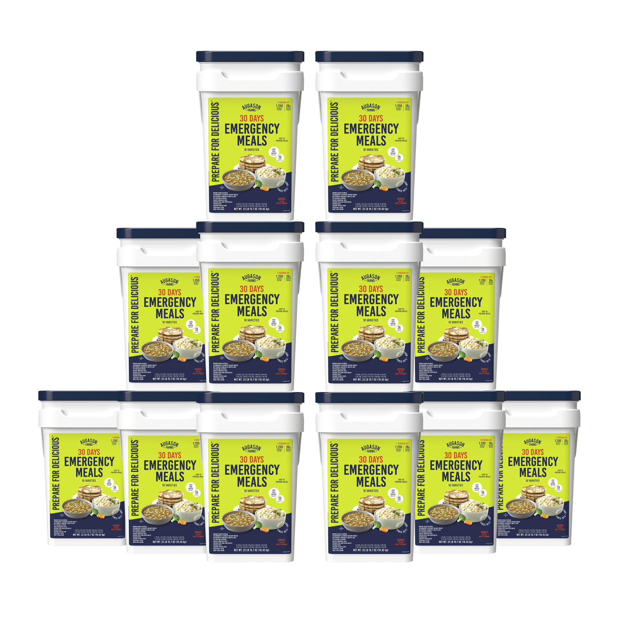 The Augason Farms 1-Year Emergency Food Supply Kit is built from 12 of our best selling 30-Day kit, offering 1,290 calories and 36 grams of protein per day, enough to sustain one person for 12-months. Each bucket includes 10 meal varieties such as Cheesy Broccoli Rice, Fettuccine Alfredo, Brown Sugar Oatmeal, and more. Perfect for emergency preparedness, off-grid living, camping trips, or simplifying busy weeks with ready-to-eat meals.