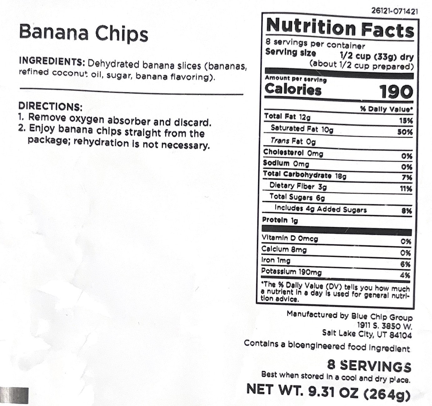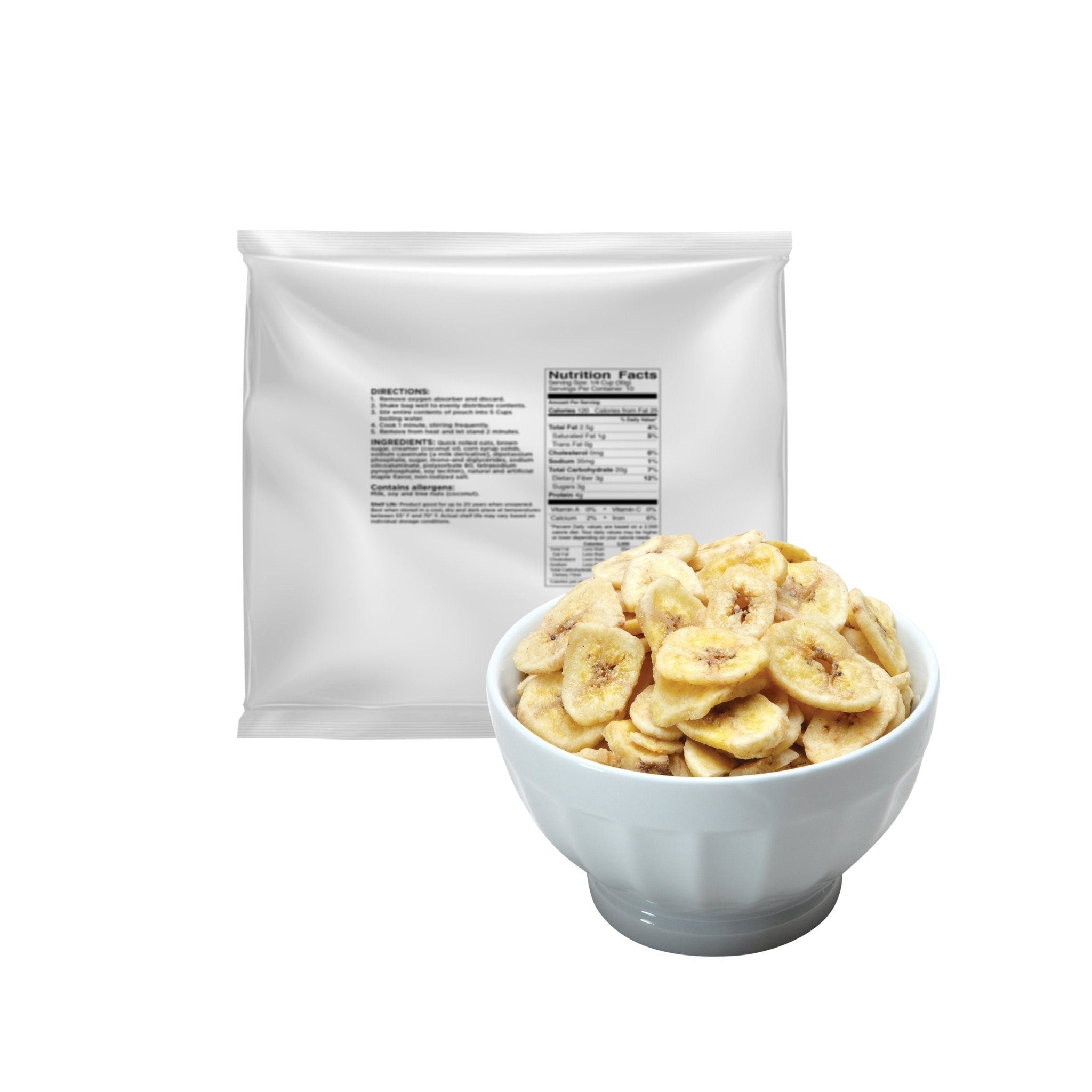 Enjoy a crisp, sweet snack made from sliced bananas cooked in coconut oil and lightly sweetened for rich flavor. These banana chips are ready to eat straight from the pouch and work well for snacking at home, on the go, or as part of your long-term food supply.