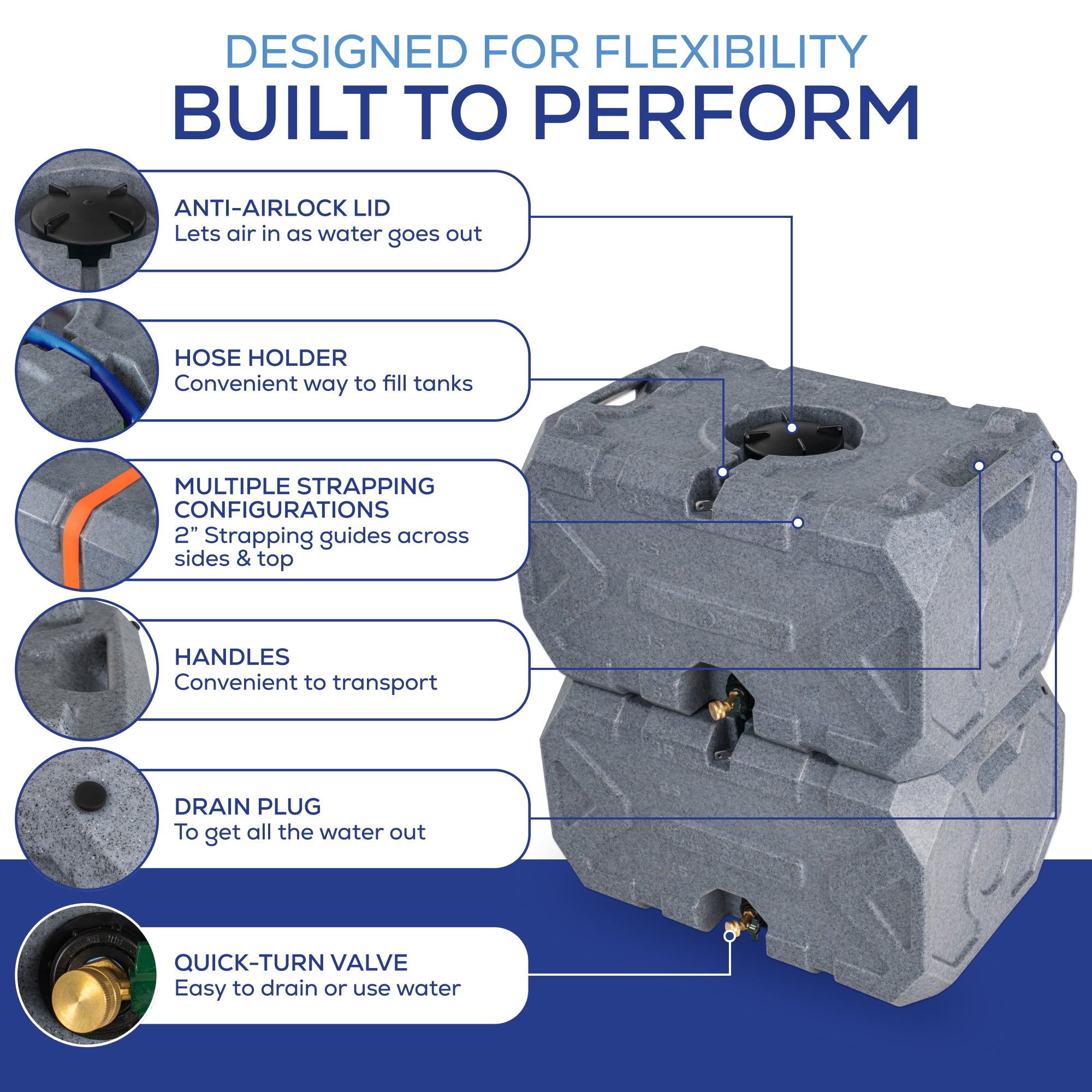 Rockwell Water Exodus 35 Gallon Water tank helps store 35 gallons of safe, clean drinking water which helps prevent water insecurity during emergencies. It holds the perfect amount of water needed to stay hydrated and cook your 30 days of emergency food supply!