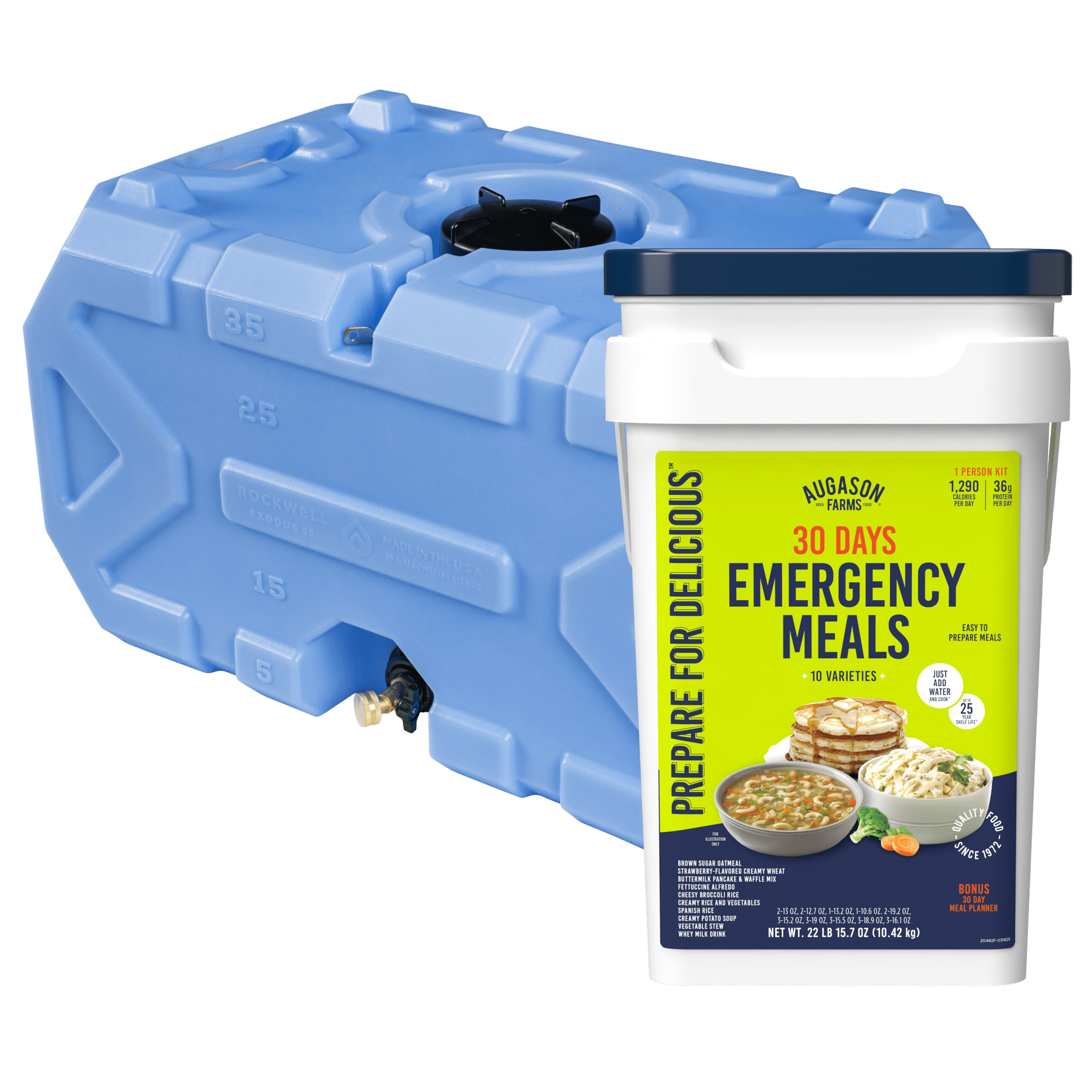 The Ultimate Emergency Starter Kit comes with a Rockwell Exodus 35 Gallon Water Tank and Augason Farms 1-Person 30-day Emergency Food Supply Kit
